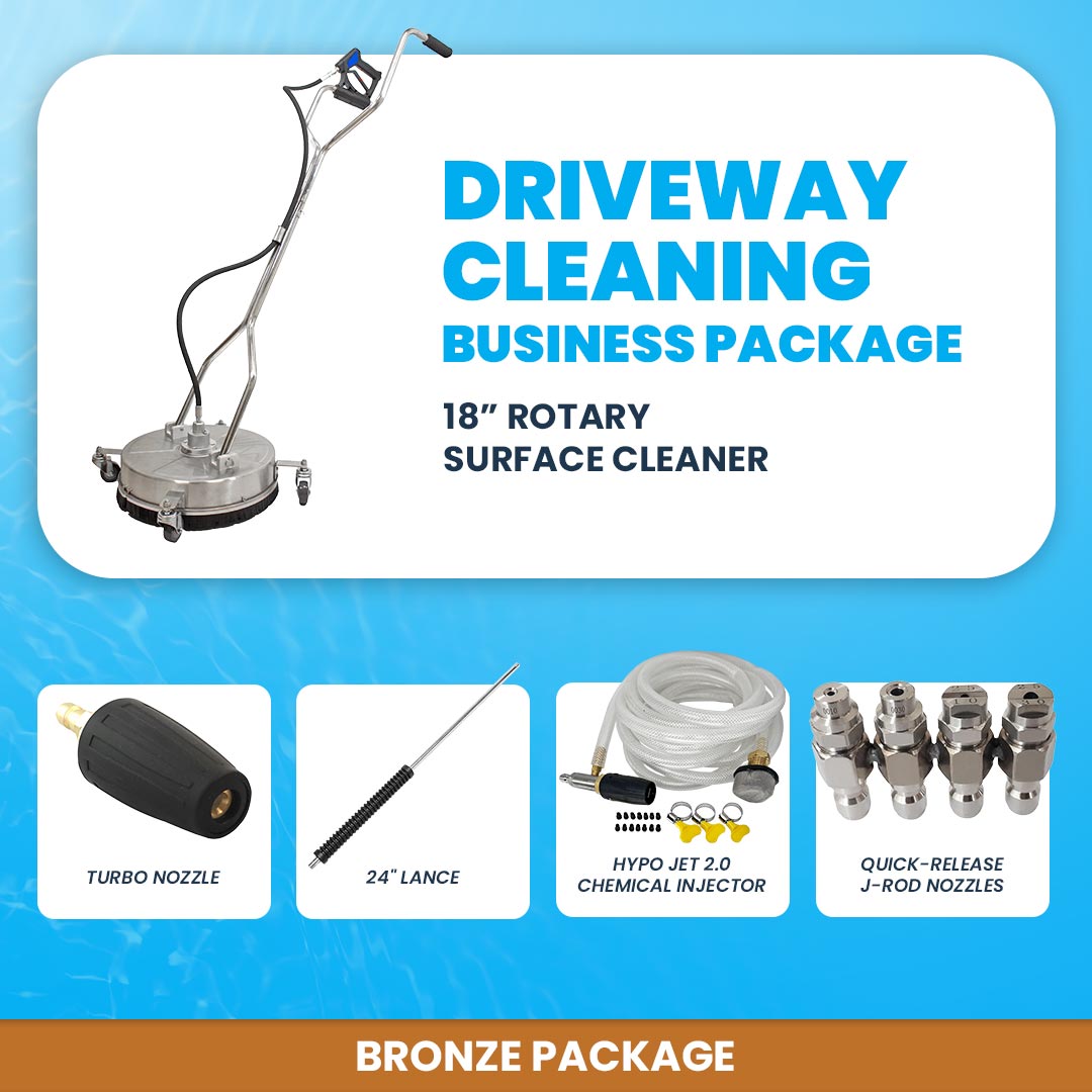 Bronze Driveway Cleaning Specialist Business Package delivers a complete range of cleaning tools, helping your business perform tasks with enhanced efficiency. This bundle includes all the necessary equipment for effective pressure washing and chemical application, making it perfect for cleaning businesses aiming for high-quality results.