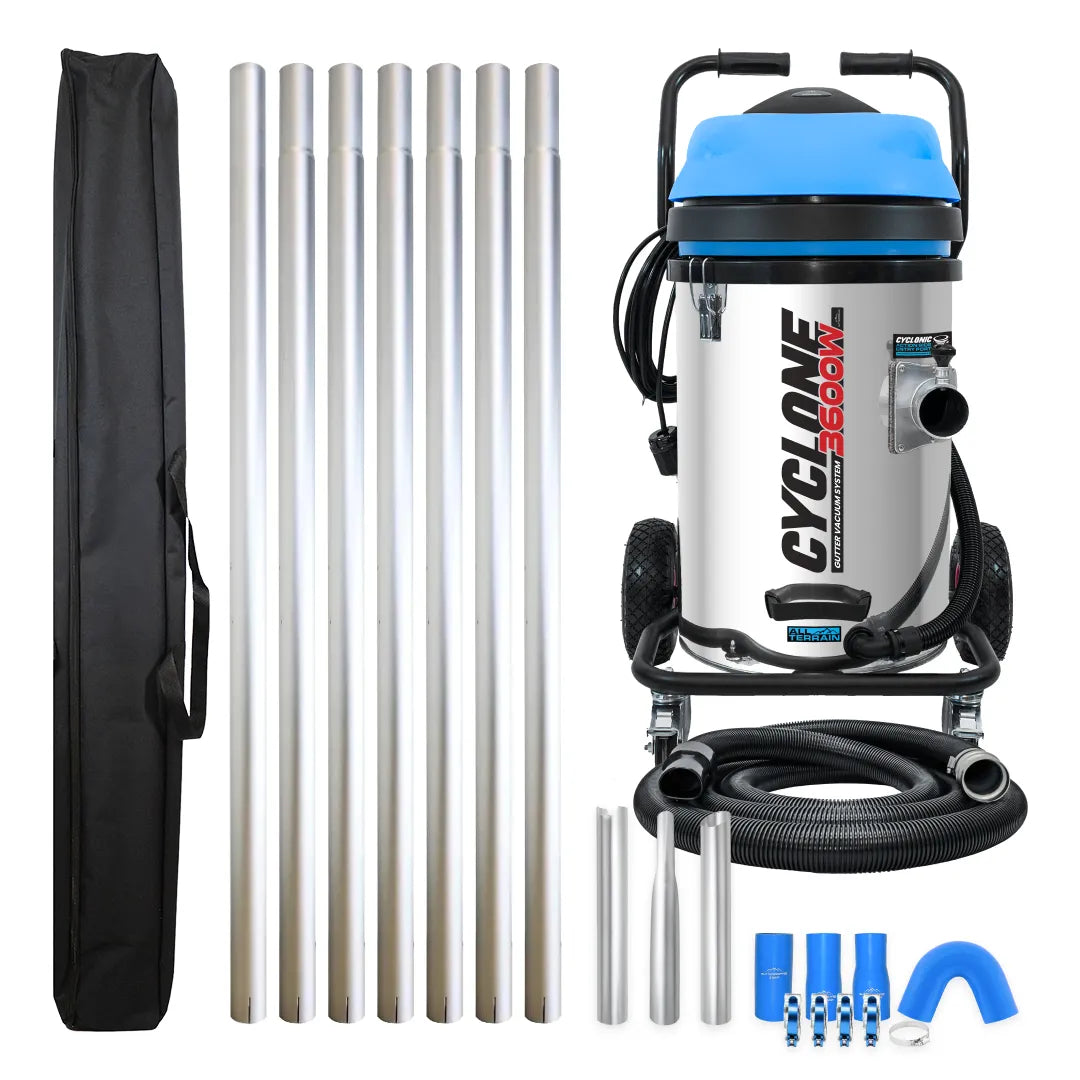 The Cyclone II 3600W gutter vacuum system will quickly pay for itself in time, safety and efficiency. Set up, work and cleanup time is greatly reduced, allowing you to get more jobs done in a day. No longer do you need to struggle with ladders and scaffolds, almost all of the work can now be done from the safety of the ground. At the core of this bundle is the powerful 20 Gallon Commercial Cyclone Gutter Vacuum, equipped with triple 1200W motors for unparalleled suction and cleaning capabilities. Ideal for professional settings, this vacuum boasts a 76L tank made from high-quality stainless steel and is designed to work seamlessly with a generator due to its 220-240V requirements.