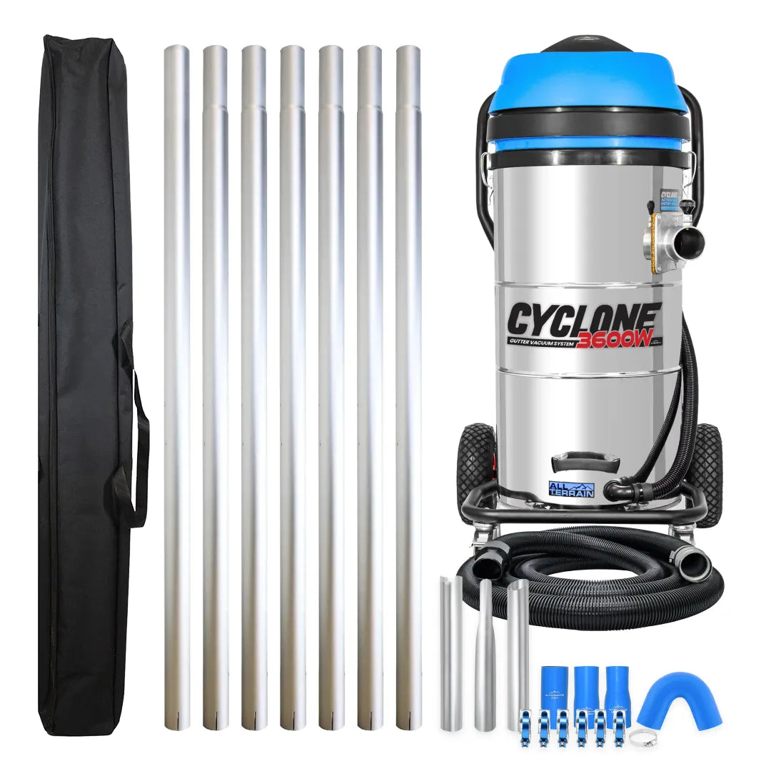 The perfect set up for professional gutter cleaning, our 27 Gallon Cyclone II 3600W Stainless Steel All Terrain Gutter Vacuum with 28 Foot Aluminum Poles and Bag bundled kit features our powerful 27 Gallon Commercial Cyclone Gutter Vacuum. With a power output of 3600W from three 1200W motors, and an extra capacity 27 gallon stainless steel tank, this machine has a strong 94.56 inch water lift and powerful 379.6 cfm airflow for fast and thorough cleaning. Its cyclonic technology and reusable filter ensure debris is smoothly processed and motors run cleanly for longer. Navigating through any terrain is a breeze thanks to the vacuum's rugged ALL TERRAIN CHASSIS, industrial-strength wheels, and reliable braking system.