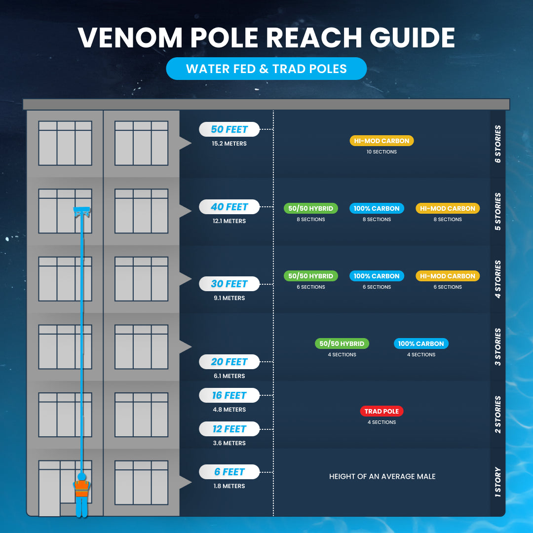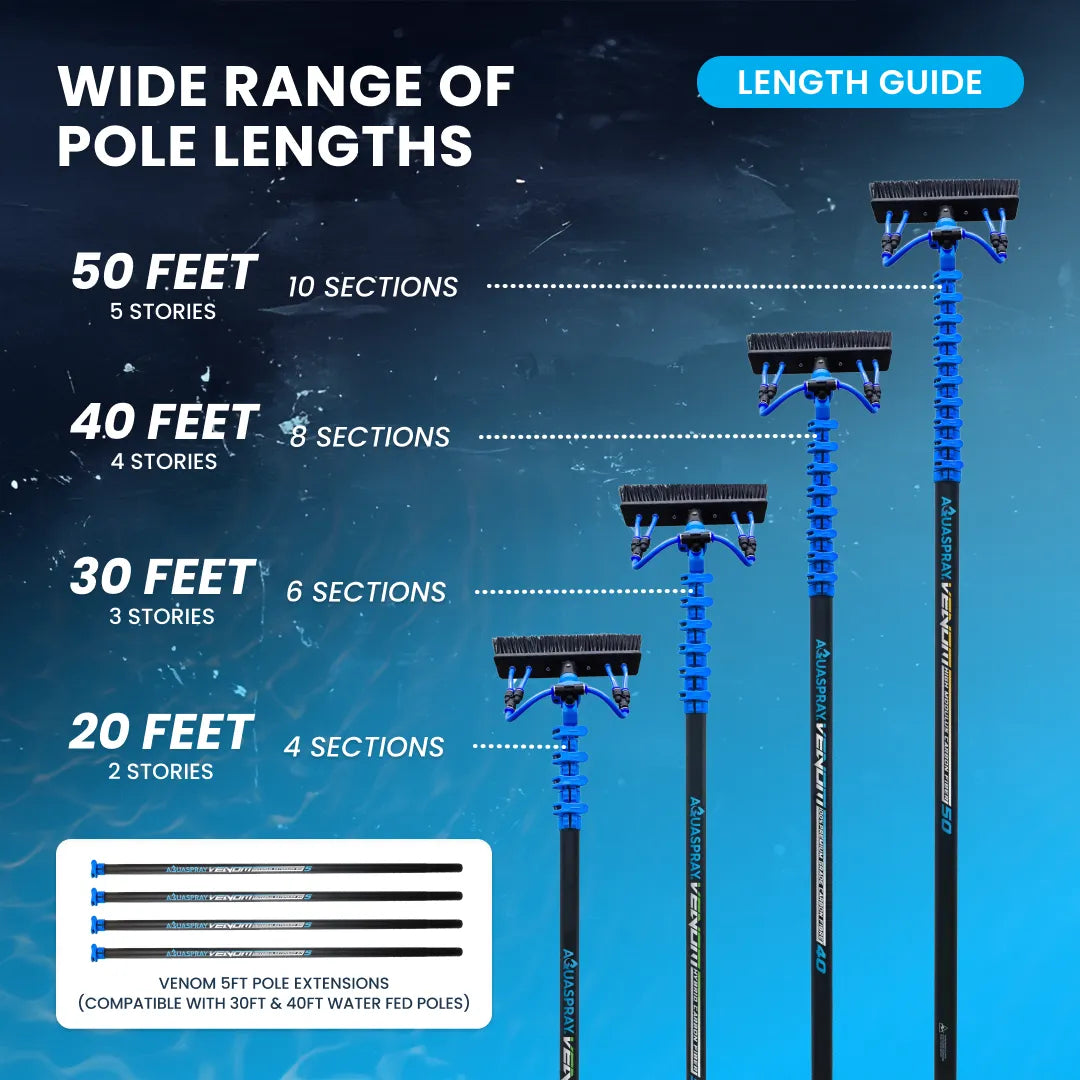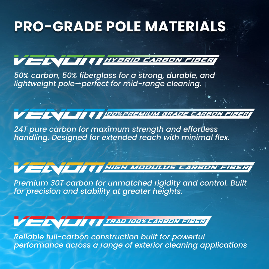 Venom Water Fed Pole: Available in multiple sizes and materials to suit various cleaning tasks. Built with anti-spin clamps for a secure grip and smooth operation.