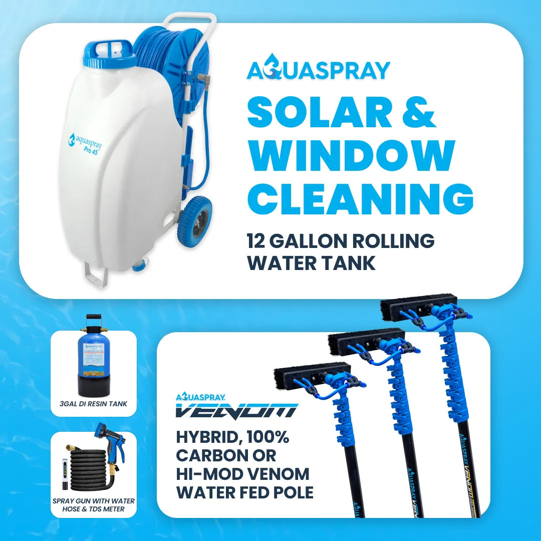 AquaSpray Pro 45 Water Pumping Tank – 12 Gallon, Battery-powered with 3 Gallon Resin Tank and Venom Water Fed Pole for Window and Solar Panel Cleaning