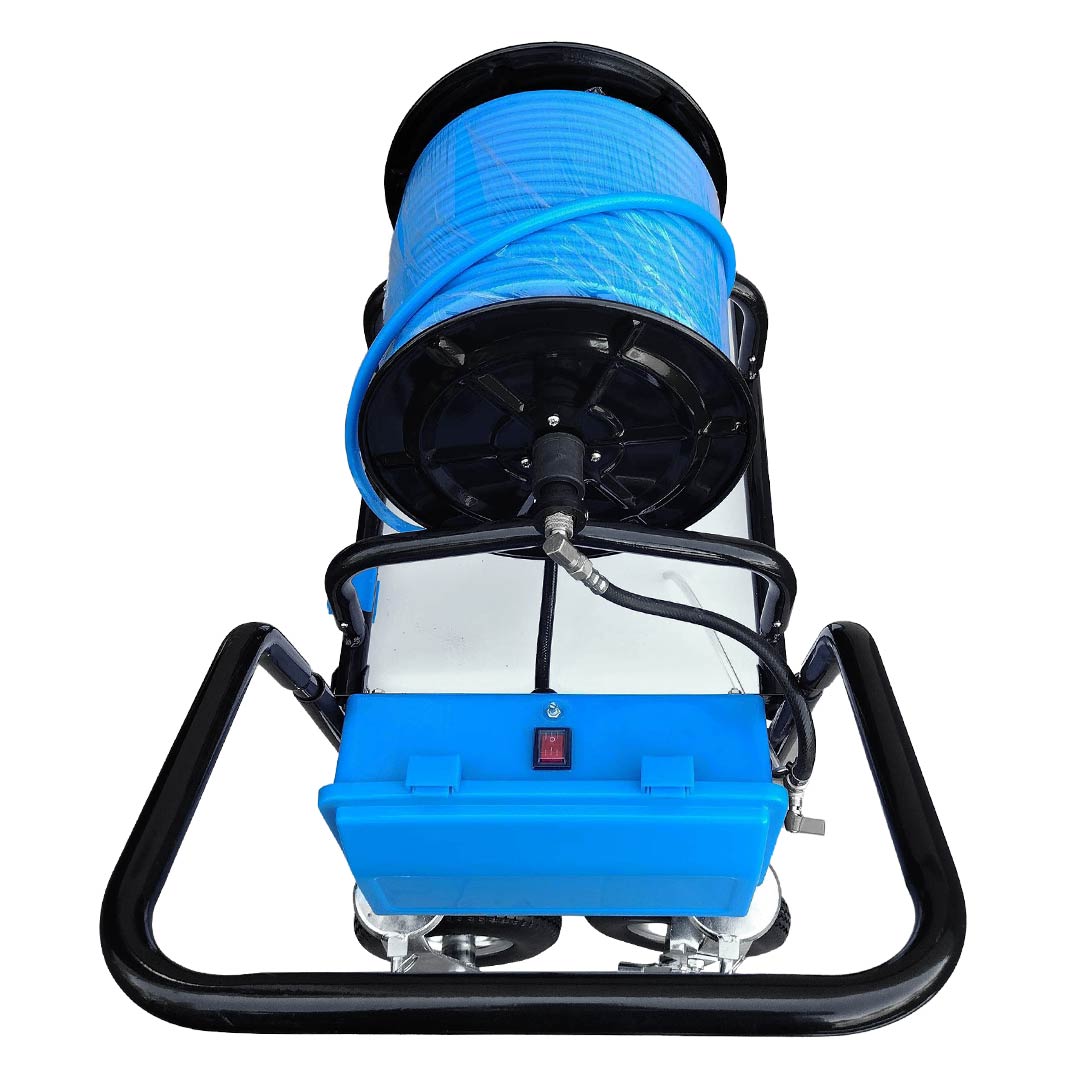 - Large-Capacity Rolling Water Tank: The 60L tank features a wide inlet collar and built-in filter for quick refilling and continuous operation. Its commercial-grade cart includes a 300-foot hose and reel, rear pneumatic tires, and lockable front wheels for stability and easy mobility.